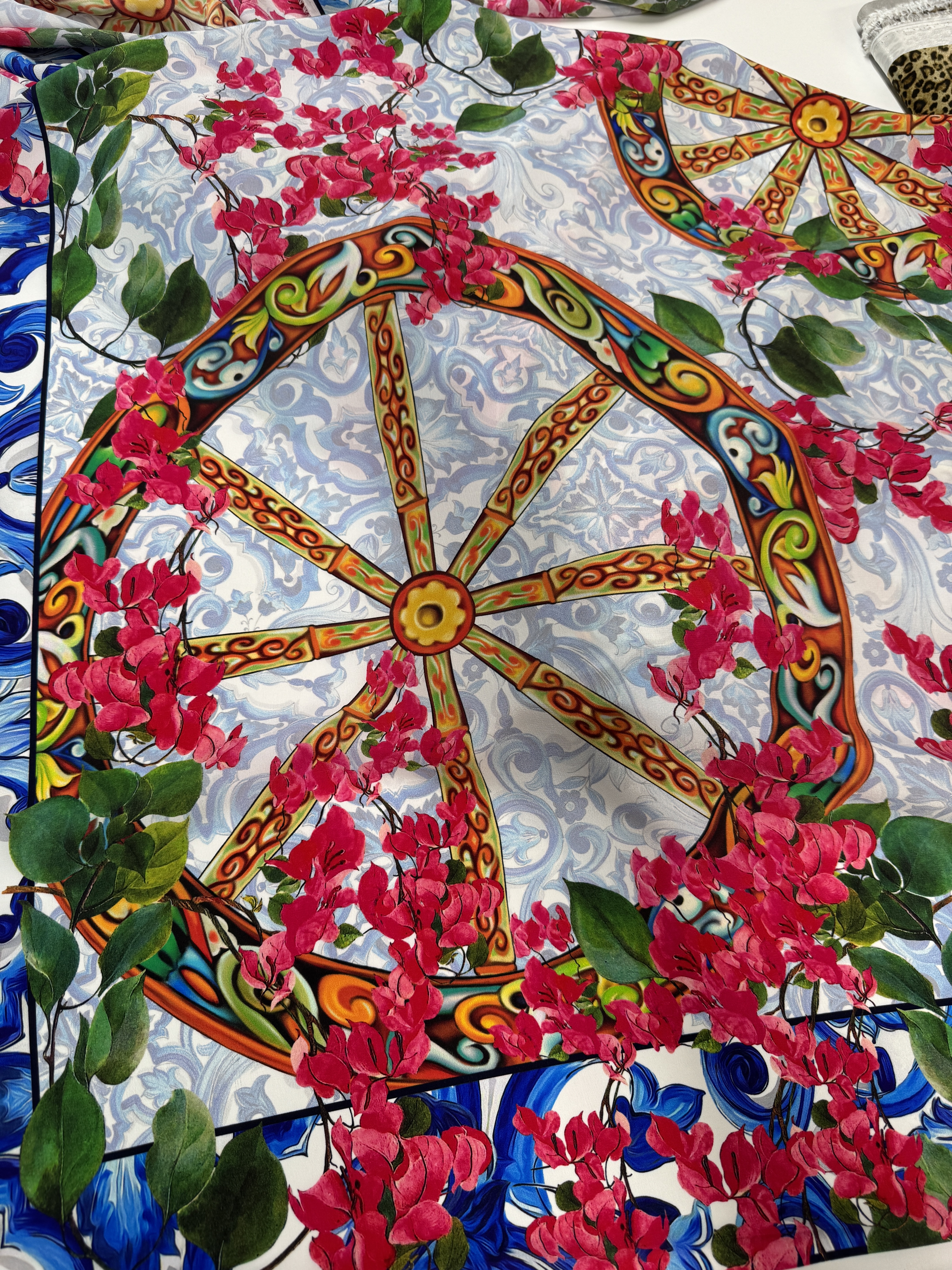 Лазурно-синяя хлопковая ткань с принтом "ромашка"